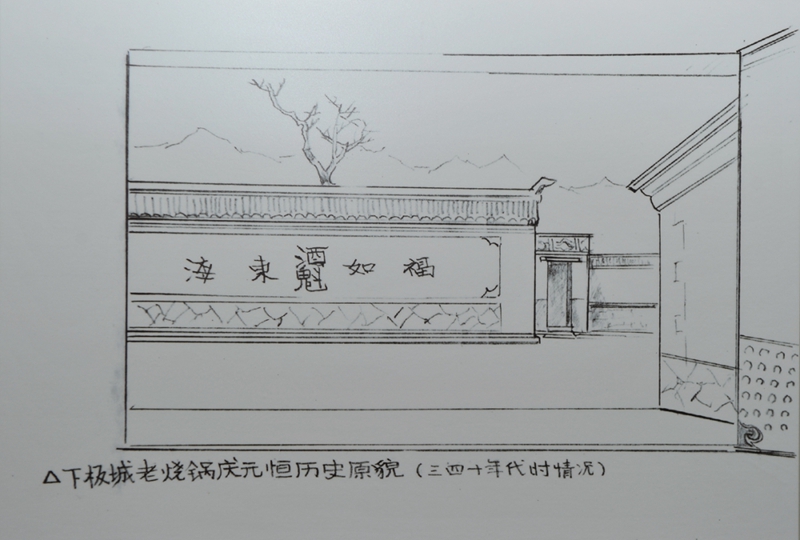 關(guān)闊去日本時(shí),發(fā)現(xiàn)了日本專(zhuān)門(mén)研究承德的學(xué)者伊東佑信先生早年在承德畫(huà)的速寫(xiě)里,有兩幅1940年前后的下板城老燒鍋慶元亨的實(shí)景記錄,非常真實(shí)。